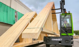 Sensoren in der vorderen Lenkachse des FSE von Combilift erlauben die jeweilige Einzelsteuerung der beiden 15-kW-Antriebsmotoren an der Hinterachse. Die Geschwindigkeit jedes Rades wird durch den Lenkwinkel der Vorderräder geregelt. Das verringert den Wenderadius wie auch den Reifenverschleiss.